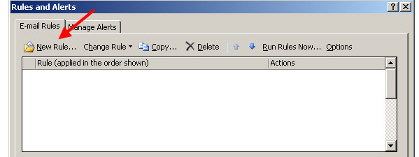 1. Dupa ce deschideti Microsoft Outlook, accesati meniul Tools si apoi Rules and Alerts. In fereastra deschisa ramaneti la tabul E-mail Rules si apasati butonul New Rule.