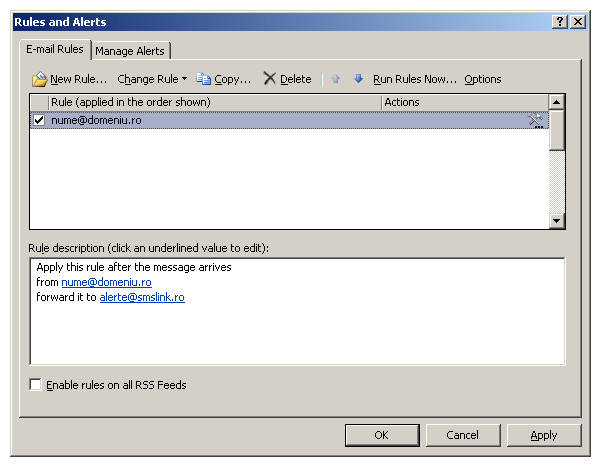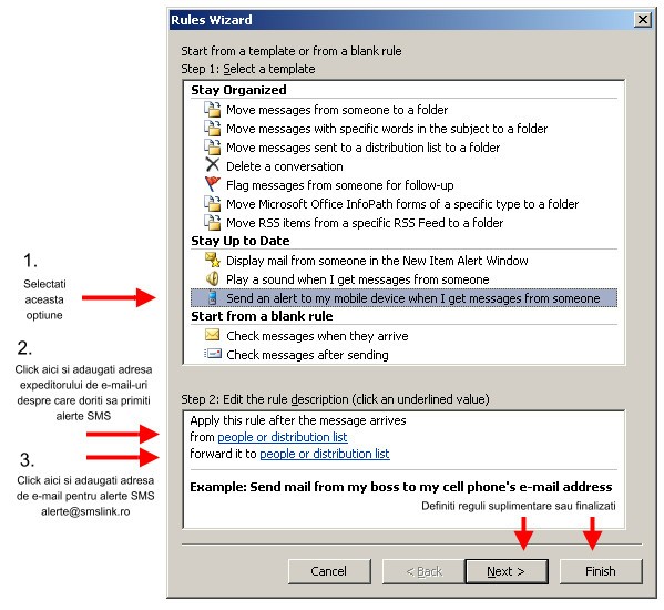 2. In urmatoarea fereastra selectati optiunea ,,Send an alert to my mobile device when I get messages from someone'' si adaugati la prima optiune ,,from people or distribution list'' adresa de e-mal a expeditorului a carui mesaj doriti sa il notificati prin SMS, iar la optiunea ,,to people or distribution list'' adaugati adresa de e-mail alerte@smslink.ro, pe care vor fi trimise alertele si convertite in SMS.