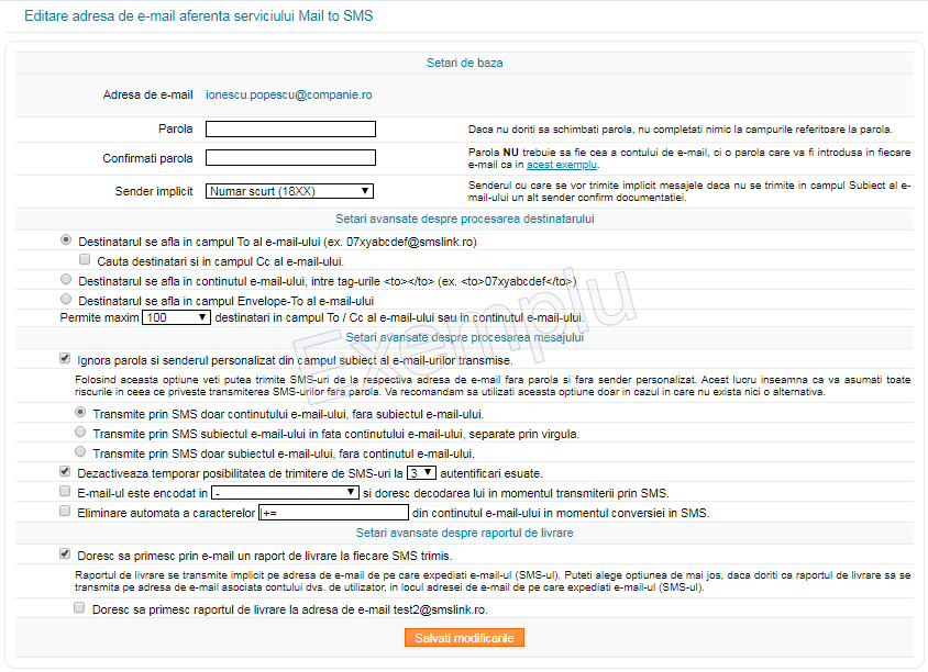 Dupa ce ati adaugat o adresa de e-mail autorizata in serviciul Mail to SMS, puteti sa o editati pentru a avea acces si la setarile avansate aferente acesteia. Editarea unei adrese de e-mail autorizate se realizeaza prin accesarea sectiunii Configurare serviciu din cadrul Mail to SMS iar apoi accesarea optiunii Editare din dreptul adresei de e-mail autorizare pe care doriti sa o editati, de la rubrica Adrese de e-mail expeditoare acceptate.