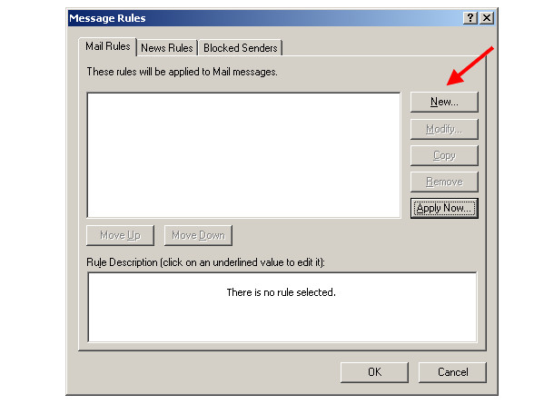 1. Dupa ce deschideti Microsoft Outlook Express accesati meniul Tools si apoi in submeniul Message Rules accesati optiunea Mail. In fereastra deschisa apasati optiunea New.