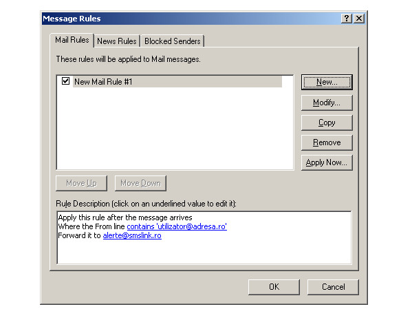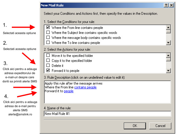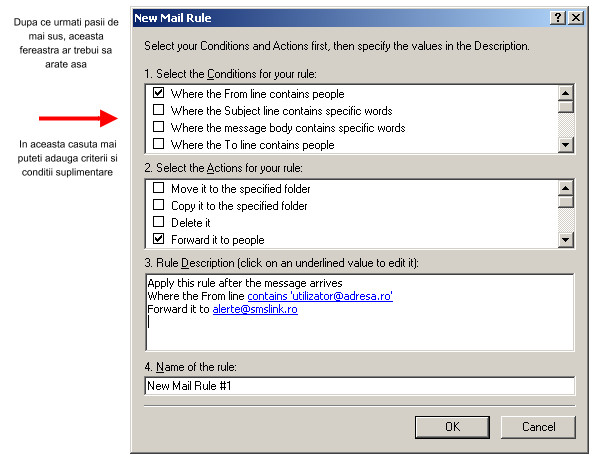 In continuare la punctul 3 vom defini persoana la care ne referim prin conditia de la punctul 1, in acest exemplu noi am ales o adresa generica utilizator@adresa.ro iar la punctul 4 vom defini adresa unde se trimit alertele pentru SMS care trebuie sa fie alerte@smslink.ro.