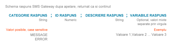 Categorie Raspuns - Raspunsurile trimise de SMS Gateway se impart in doua mari categorii: MESSAGE - care are rol de confirmare a operatiunii care a avut loc si returnarea de variabile utile urmaririi operatiunii si ERROR - care are rol de raportare anuntare si raportare a unei erori care a fost intampinata in procesarea cererii. Categoria raspuns returnata este case sensitive.