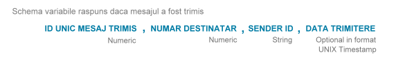 Se observa ca forma raspunsului este ca cea descrisa in schema de la capitolul anterior. Acest raspuns contine si Variabile Raspuns. Acestea, in cazul categoriei de raspuns MESSAGE cu ID raspuns 1 sunt in urmatoarea ordine: